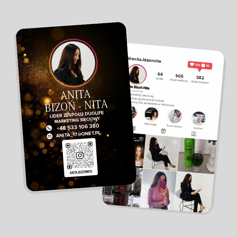 Nasze InstaWizytówki to must-have 2025 roku – połączenie klasycznej wizytówki z cyfrową funkcjonalnością. Dzięki kodowi QR Twoi klienci i obserwatorzy błyskawicznie znajdą Twój profil na Instagramie lub dowolny link, który wybierzesz.